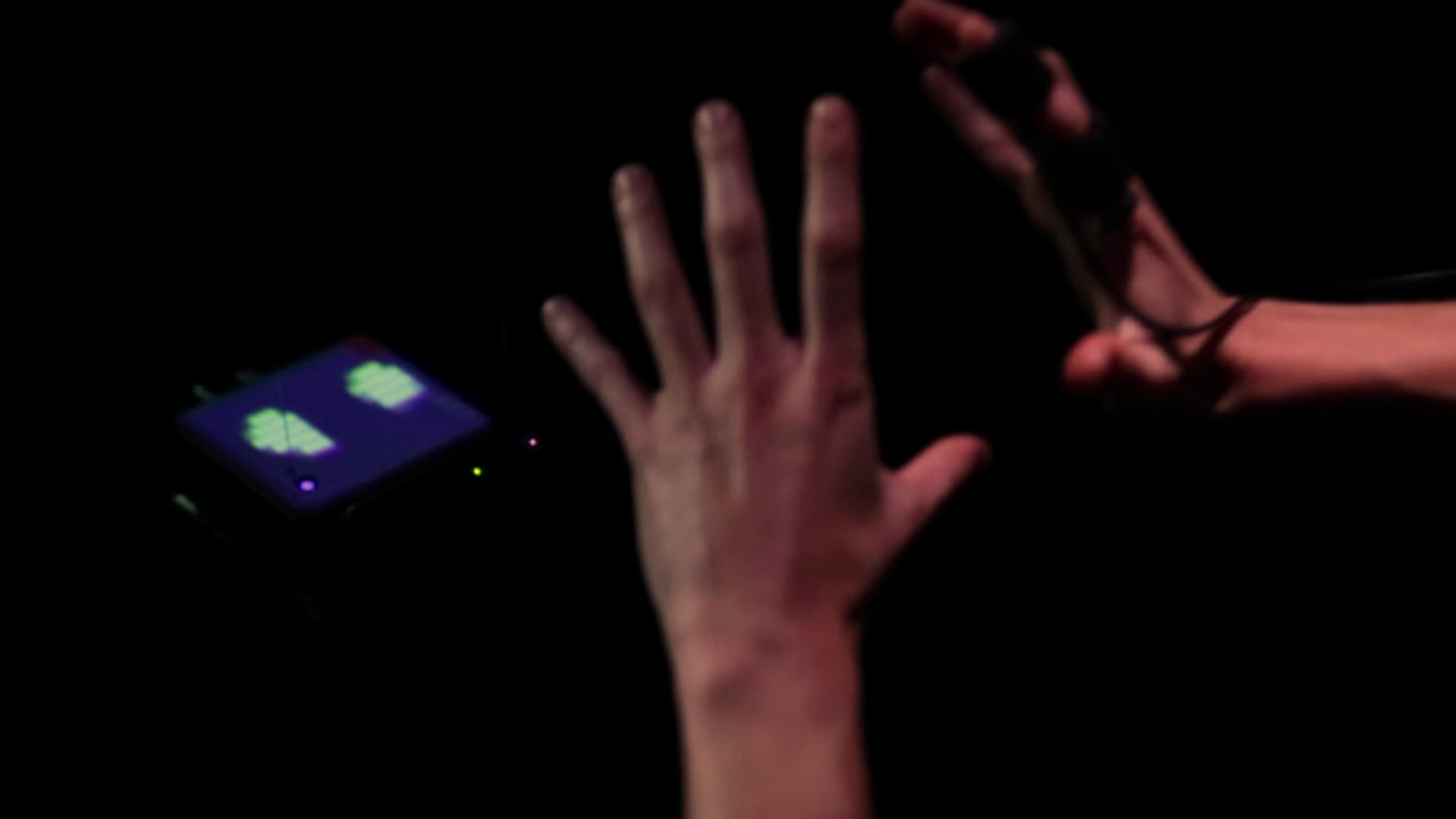 The second piece of the Instrumentarium - the SOMAPHONE Base Station includes an INTEL® RealSense™ 3D camera F200, tracking the motion of the hands in 3D space, a touch-screen to control the audio-visual performance and a powerful mini computer - INTEL® NUC 5i7RYH - performing the actual audiovisual synthesis. The 3D camera is used to extract information about the movement, such as phrasing and segmentation, recognition of postures and gestures. The motion tracking and the biofeedback signal analysis, as well as the visual and musical synthesis are tightly interconnected and allow a digital artist to form feedback loops between different media and the performer. |